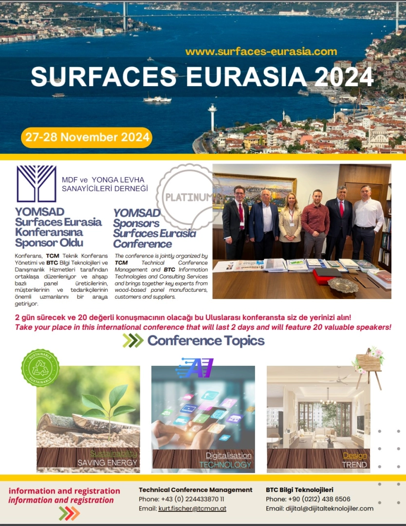 27-28 Kasım tarihleri arasında İstanbul’da düzenlenen 2024 Surfaces Eurasia Konferansı TCM Teknik Konferans Yönetimi ve BTC Bilgi Teknolojileri ve Danışmanlık Hizmetleri tarafından ortaklaşa düzenlendi. Ahşap bazlı panel üreticilerinin, müşterilerinin ve tedarikçilerinin önemli uzmanlarını bir araya Etkinlik İstanbul Marriott Asia Oteli’nde düzenlendi.